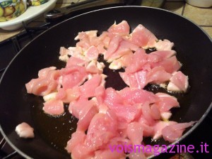 Tagliare il petto di pollo a pezzettini e farlo rosolare in una padella con un po’d’olio.Pulire i funghi, tagliarli a pezzettini