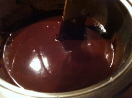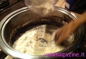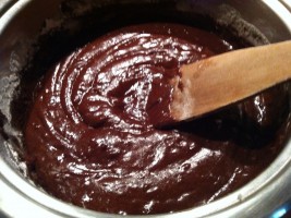 Sciogliere in una pentola il cioccolato,burro, latte e zucchero. Togliere dal fuoco e aggiungere a poco a poco la farina e il lievito.