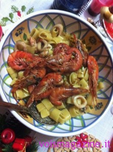 Preparare un trito di aglio, prezzemolo e peperoncino e farlo rosolare in una padella con un po’ d’olio.Aggiungere il pomodoro passato e farlo cuocere pochi minuti dolcemente.Aggiungere i calamari tagliati ad anelli ,i gamberoni (lasciandone qualcuno con il guscio per la presentazione del piatto) e le cozze precedentemente aperte con il loro brodetto filtrato.