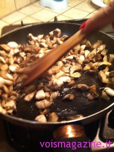 Tagliare il petto di pollo a pezzettini e farlo rosolare in una padella con un po’d’olio.Pulire i funghi, tagliarli a pezzettini