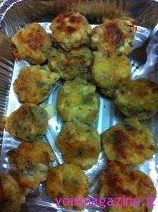 saltarli in padella.In una ciotola unire il pollo ,i funghi e aggiungere la panna,il prosciutto e il formaggio.Aggiustare di sale, formare delle polpettine e passarle nella farina e nel pangrattato. Si possono friggere o cuocere al forno.