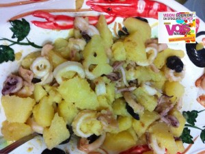 Lessare le patate,lasciarle raffreddare un po’ e poi tagliarle a fettine e condirle con olio,sale e prezzemolo. Pulire i calamari,tagliarli a rondelle e cuocerli in padella con un po’d’olio,aglio e una spruzzata di vino. Appena saranno cotti unirli alle patate e infine aggiungere le olive.