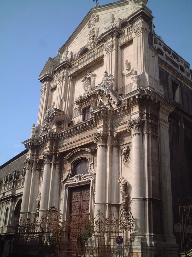 Facente parte di una sequenza ininterrotta di chiese e monasteri che popolano via Crociferi, la chiesa di S.Benedetto rappresenta il momento più alto del decorativismo tardo-barocco catanese. L’attuale aspetto della chiesa risale alla sua costruzione dopo il terremoto del 1693 che aveva distrutto l’antico tempio adorno di pitture sculture,marmi e arredi preziosi. In quel tragico evento morirono 55 delle 60 religiose che vivevano negli edifici sorti accanto alla chiesa.Nel Luglio dello stesso anno si cominciò a costruire il nuovo monastero, nel 1704 fu innalzato l’arco di S.Benedetto e nel 1708 cominciarono i lavori di sgombero e ricostruzione della grande chiesa. La (autore ignoto) è in pietra calcarea con il primo ordine segnato dalle semicolonne con capitello che sorreggono una trabeazione dentellata e un timpano spezzato con le allegorie della”Temperanza” e della “Fortezza”. Altre statue a tutto tondo, che caratterizzano la teatralità barocca tendente a trasformare le chiese in scenografie teatrali, rendono plastico il prospetto sul quale spicca il grande portone con le storie di S.Benedetto. L’interno è preceduto da un vestibolo con pavimenti realizzati con marmo policromo; doppie gradinate a tenaglia sono sottolineate da una balaustrata sinuosa su cui poggiano otto figure di angeli. Alla fine della scalinata ,si trova una bussola a vetri incisi realizzata nel secolo passato.