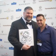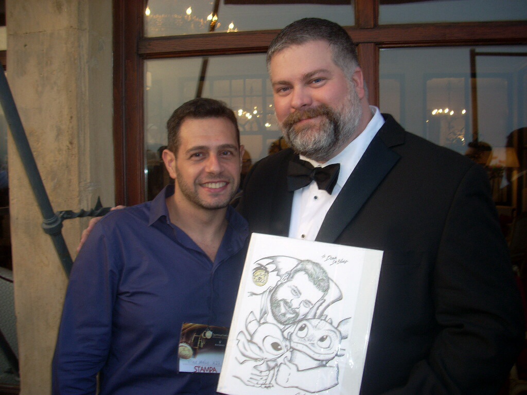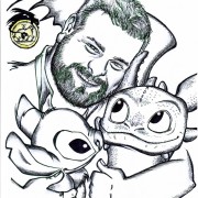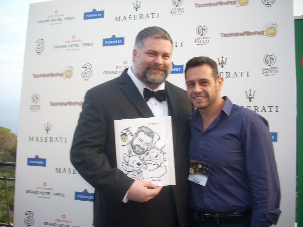 ma, soprattutto, vignettista. E, complice il fatto di consegnare loro un regalo del tutto personale (oltre che “personalizzato”) dal quale trasuda nient’altro che l’ammirazione per il personaggio e per il cinema, sentimenti filtrati entrambi dalla passione per il disegno, l’esito dell’incontro si è rivelato sempre vincente. E questo nonostante la macchina organizzativa del festival di Taormina si sia dimostrata sempre poco “sensibile” nei confronti di un affettuoso fuori programma come quello da me proposto ormai da 13 anni. Dopotutto la consegna di una vignetta o di un ritratto, frutto di lavoro e abnegazione, sono momenti che “rubano” ai protagonisti appena pochi istanti ma lasciano questi ultimi sempre soddisfatti nonchè (con mia reciproca emozione) visibilmente felici per una manifestazione d’affetto che non si aspettavano, anche perché decisamente lontana dalla tipica richiesta di foto o autografi. Di abbracci, strette di mano, ringraziamenti con gli occhi vivi ne ho ricevuti parecchi (da Willem Dafoe a Robert Duvall, da Giuseppe Tornatore a Fanny Ardant, da Jack Black a Jeremy Irons). Forse per questo nessuno all’interno dell’organizzazione del festival ha visto mai di buon occhio la cosa; perché sono istanti di partecipe autenticità che cozzano fra tanta, ipocrita patina glamour. Ma va bene così. Perché quando si incontrano personaggi come Dean DeBlois, regista di gioielli come Lilo e Stitch e Dragon Trainer, invitato a Taormina per presentare il secondo capitolo di quest’ultimo, non si può che rimanere soddisfatti. Un incontro con un nome meno altisonante (e quindi meno “paparazzato”) che si risolve in foto, complimenti e perfino una chiacchierata in inglese non ha davvero pari. DeBlois è gentilissimo e affabile come pochi e fa sentire a suo agio tutti nonostante la sua figura massiccia e imponente. Ma lo sguardo si scioglie ancora di più dinanzi al piccolo omaggio da me realizzato per l’occasione in cui lo ritraggo abbracciato alle sue creature più famose. Lui lo comprende e ringrazia subito e per tutta la serata, ogniqualvolta ci si incrocia durante il cocktail esclusivo al Timeo. Ha capito che l’abbraccio del disegno non è altro che quello metaforico che si rinnova fra il pubblico e le “creature” da lui consegnate sullo schermo. Perché solo chi organizza il festival non ha compreso mai la necessità di far spazio a questo cuore?