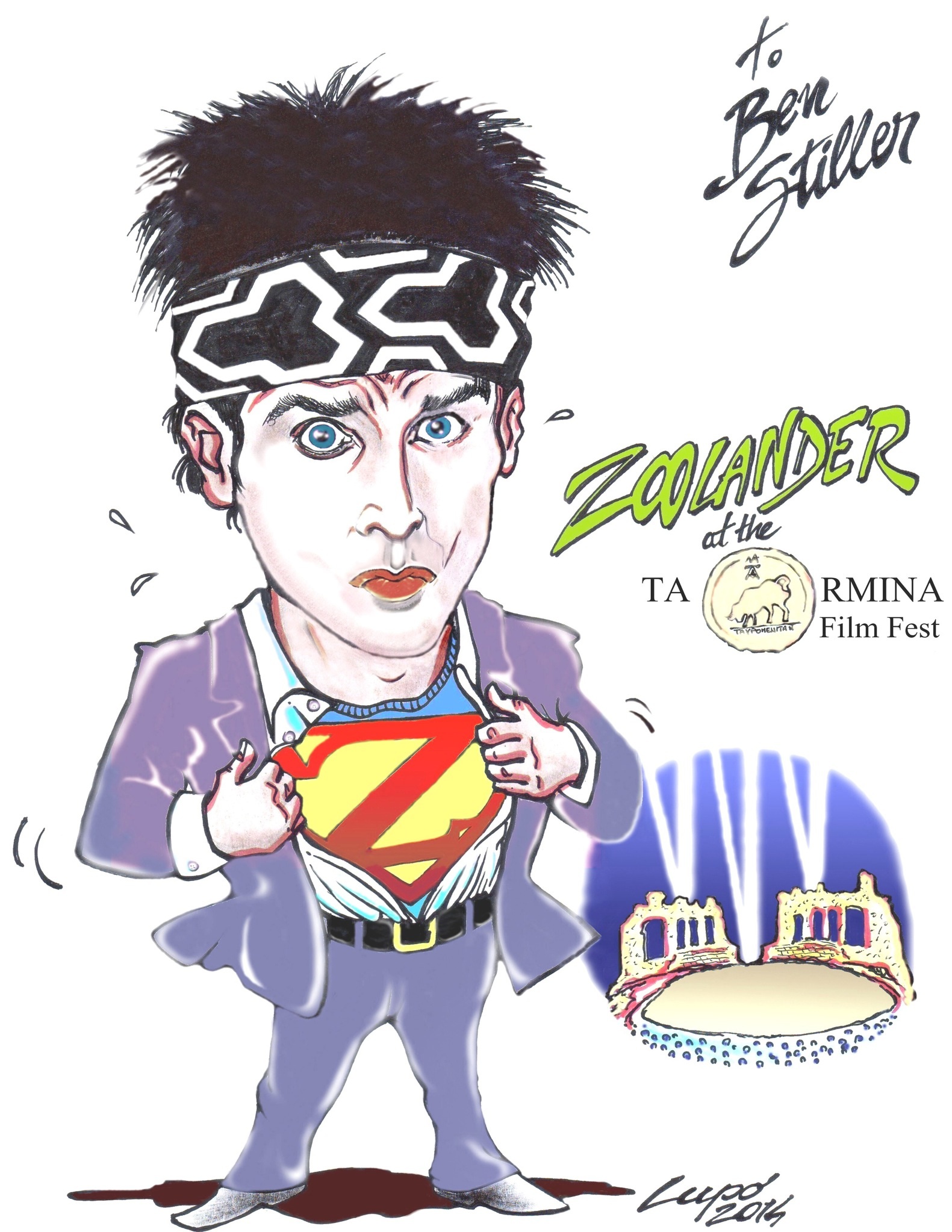 Non potevo scegliere che questa folle incarnazione per celebrare al meglio il talento di un attore capace sia di suscitare il riso (soltanto con lo sguardo) che di convincere pienamente sul versante serio e malinconico (vedi “I sogni segreti di Walter Mitty”, suo ultimo gioiello in veste di regista e interprete). Della 60° edizione del Taormina Film Fest sarà il grande Ben ad essere ricordato come l’incontrastato re oltre che il protagonista di una TaoClass memorabile per professionalità e simpatia. Professionale perché l’attore non ha mancato di soffermarsi con serietà sul suo mestiere, sul senso profondo e la necessità dell’essere comici al cinema e sulla “sottostima” che ancora affligge il genere soprattutto in tema di premi (Oscar). Simpatia perché l’attore, pur blindato da una security che ne impediva il contatto col pubblico (ad eccezione di un bambino che è stato scortato sul palco per vedere esaudito il desiderio di un autografo sul poster di “Una notte al museo”), non si è sottratto neanche un attimo al rito degli autografi (centinaia), elargiti per almeno un quarto d’ora in mezzo al sudore e le urla esagitate dei giovanissimi. E se un vero e proprio “selfie” per molti di loro non si realizzerà, così come per il sottoscritto una foto insieme a lui, il disegno che ho avuto modo di donare all’attore nel corso della conferenza mi ha regalato non solo una delle più belle soddisfazioni come vignettista ma anche uno scatto impagabile e a suo modo “storico”. Perché se le domande su “Zoolander” e su un suo possibile, attesissimo sequel rimpallavano praticamente da un giornalista all’altro, quel vedersi improvvisamente omaggiato in vignetta proprio come il suo svanito fotomodello alle prese con la sua espressione più tipica, deve avere eccitato non poco il comico naturale che è in lui. Ecco quindi che, dopo aver accolto il mio dono con una risata e dopo avermi ringraziato, Stiller ha regalato a me e al pubblico del Palacongressi una performance (in)attesa, improvvisando la sua mitica espressione “Magnum” (o “Blue Steel”) accanto al mio disegno, fra l’ovazione del pubblico e i flash impazziti dei fotografi. Il mio orgoglio nell’aver sollecitato quel momento è stato grandissimo, almeno quanto la gratitudine che dovrò per sempre a Stiller per uno degli scatti più belli (e a dir poco promozionali!) di tutta la mia carriera di vignettista "non ufficiale" delle star del Festival. L’ultimo saluto, quando la bolgia dei ragazzini non accennava ancora a diminuire e l’attore veniva già scortato fuori, è stato per me. Un’amica in mezzo alla folla urla a Stiller che sono io l’autore del disegno. Lui si blocca e si abbassa giù dal palco per stringermi vigorosamente la mano e ringraziarmi. “Thank you, thank you very much!” dice con lo sguardo "vero" dell'uomo Stiller (e non più del modello Derek) un attimo prima di andare via. Thanks also to you, mr. Zoolander!