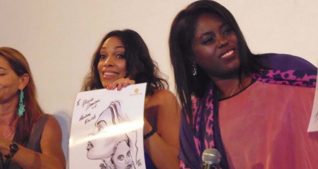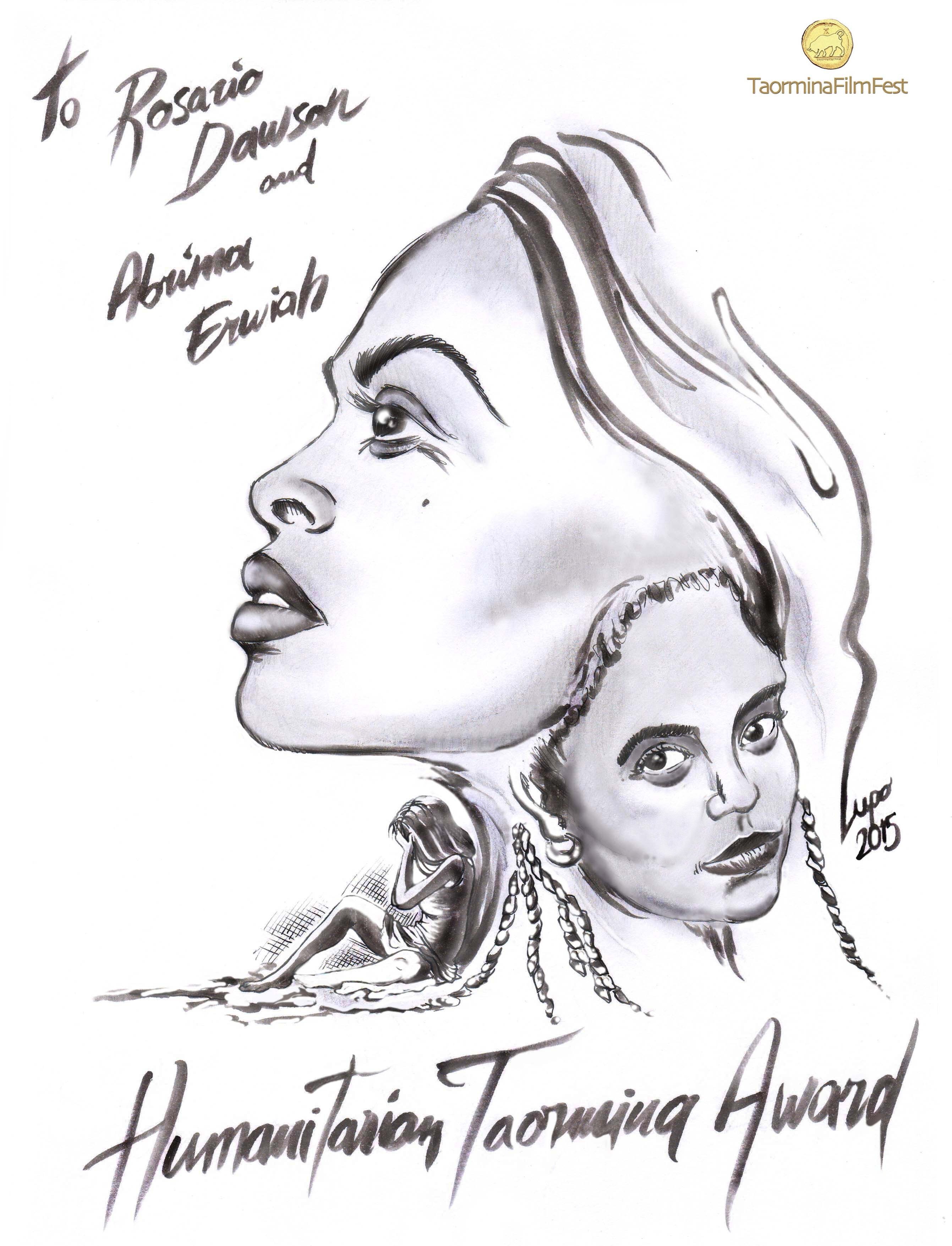 E se alla gioia di questo Campus segue l’attesa un po’ snervante (quasi un’ora) per il successivo, la (montante) Rabbia di alcuni presenti svanisce subito all’apparire delle splendide e solari Rosario Dawson e Abrima Erwiah, giunte a Taormina per ritirare l’Humanitarian Taormina Award per il loro progetto di solidarietà sociale, lo “Studio One Eigthy Nine”. Una linea di moda artigianale, creata dalle mani delle lavoratrici africane, che si propone come strumento di riscatto sociale ed economico per le comunità locali e soprattutto per quelle donne vittime silenziose di violenza. Un investimento industriale encomiabile (i ricavati vanno direttamente alle lavoranti) che mette in ombra ogni celebrazione festivaliera della Dawson-attrice (La 25°ora, Sin City, In trance), permettendo piuttosto di portarne alla luce tutta l’umanità insieme a quella della sua “gemella” straordinaria e indispensabile, l’esperta di moda Abrima Erwiah. A loro, incantevoli e sincere come poche, va l’omaggio illustrato di Vois che le celebra, opportunamente, per l’impegno così intrapreso.