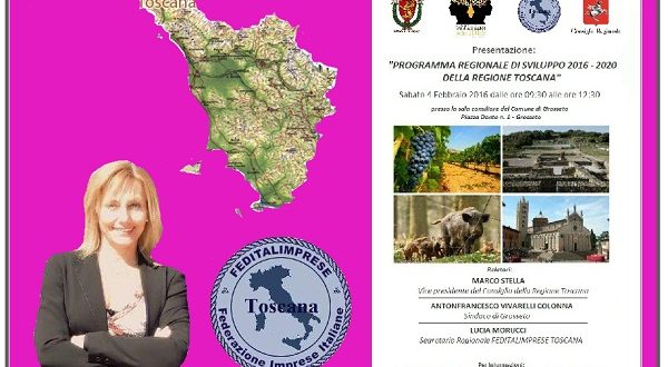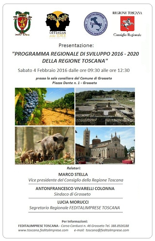 Si è svolto sabato 4 febbraio 2017 dalle ore 09:30 alle ore 12:30 presso la sala consiliare del Comune di Grosseto, in piazza Dante n. 1, il convegno illustrativo dal titolo “Programma regionale di sviluppo 2016-2020 della Regione Toscana”, una giornata dedicata alla presentazione del programma rivolta alla classe imprenditoriale toscana.