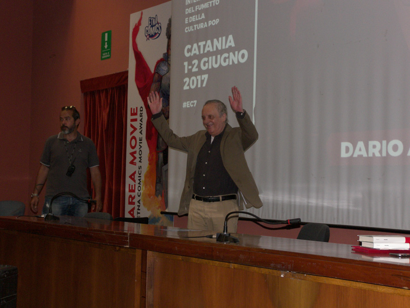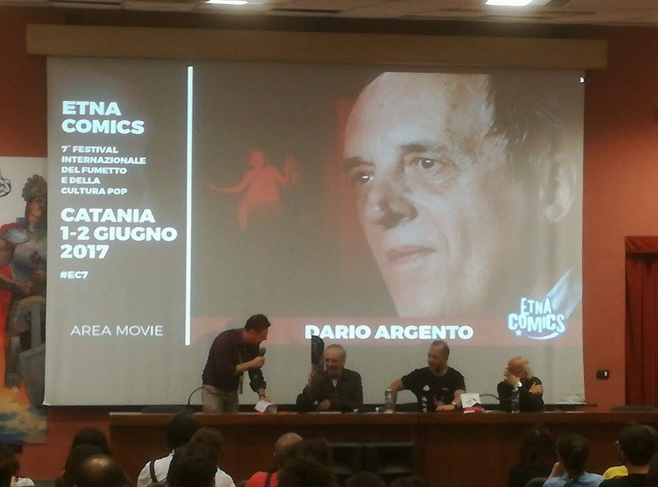 Nomen omen. Se è vero, come sostenevano i latini, che in ogni nome sta racchiuso il presagio del proprio destino, nel mondo del cinema è allora il cognome a essere l’elemento peculiare e quasi anticipatore dell’arte di chi lo porta. Argento, nella sfera cinematografica e psicologica dello spettatore comune, è sinonimo di un bagliore sinistro, l’evocazione non tanto del prezioso metallo quanto delle forme minacciose che lo stesso assume, quelle aguzze di una lama pronta a penetrare il cervello prima ancora che le carni. E’ la forza immaginifica del cinema a far diventare il cognome il medium ideale di simili sensazioni. E quale, fra le emozioni conosciute dall’uomo fin dal suo primo battito di ciglia, è la più primordiale se non la paura? Il cinema stesso dopotutto non ha battezzato i suoi primi spettatori col crisma originario del terrore (nello specifico quello di venire travolti da un treno in corsa)? La paura ci risveglia inconsapevoli non appena distaccati dal grembo materno e precede infine il nostro ultimo assopirsi dentro quello altro ed eterno. Non è più forte probabilmente dell’amore ma di certo l’ha sempre preceduto. Dario Argento è la paura o quantomeno un sinonimo di essa da quasi 50 anni. E se la paura è popular allora può diventare anche ospite speciale al Festival della cultura pop per eccellenza. Etna Comics 2017 nel giorno inaugurale, ha accolto il maestro della paura Dario Argento fra i gorgheggi di Cristina D’Avena, fumetti da ogni dove e cosplayer. Un matrimonio insolito ma anche, probabilmente, ben riuscito. Perché la filmografia di Dario Argento non soltanto vive sedimentata dentro l’immaginario fantastico e horror globalizzato, ma coesiste insieme ad altre suggestioni dentro molti subconsci. E’ il capitolo fondamentale di una biografia ludica in cui l’orrore riusciva ad incubarsi in mezzo a sogni più confettati (chi scrive vedeva sì “Bim, Bum,Bam” ma provava anche un’attrazione irresistibile per il poster di “Inferno” e gli spot televisivi di Italia 1 su “Profondo rosso” e “4 mosche di velluto grigio”). Un teorema sulla paura che occupa lo spazio nero sospeso fra due parentesi rosa. O, se preferite, un apostrofo rosso a forma di rasoio che ancora ci insegue.